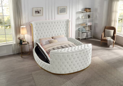 Make a bold statement in your bedroom with this luxurious round-bench bed, designed to elevate your space into a glamorous retreat. The elegant ivo...