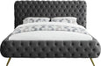 Surround yourself in modern luxury when you add this Delano Grey Velvet King Bed to your bedroom oasis. Sumptuous by design, this bed features all-over button tufting for a look that is nothing short of stunning. This dimensional bed features a heavily padded headboard and side rails, each covered in magnificent-to-the-touch grey velvet for a look that's upscale and simply divine. Metal legs on this bed allow easy clearance for vacuuming, and the bed uses just a mattress, so there's no need for a box spring or foundation, which only adds to its sleek look.