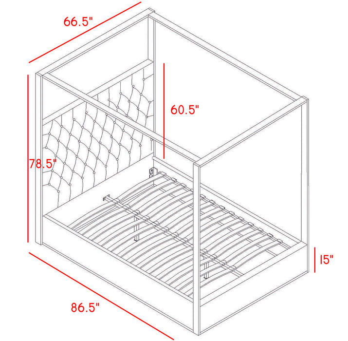 Dream big in the Porter green velvet canopy bed. This handsome Meridian Furniture bed has a tufted headboard that stands a full 60 inches tall, giving the bed a regal and sophisticated look. The headboard is tufted for added elegance, and the bed comes with a chrome canopy, adding to its overall elegance and grandeur. Green velvet fabric used on the sides and headboard gives it a luxe vibe, and the headboard is heavily padded, making it an ideal backrest for reading or watching TV.
